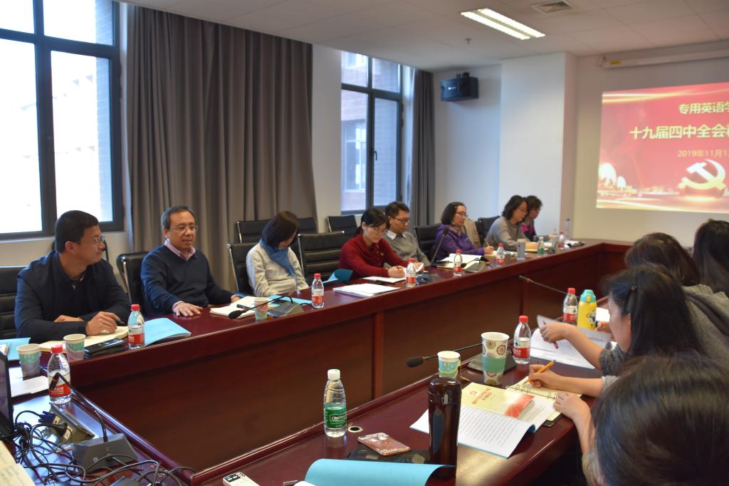 蔡鸿结合《决定》中的要点谈了自己的学习体会,认为《决定》中“科学制度”内涵丰富、意义深远,并结合“构建服务全民终身学习的教育体系”和“推进合作共赢的开放体系建设”两部分内容,谈了立德树人体制机制、高科技支撑的现代化教育、“一带一路”倡议对新时代英语教育教学要求的认识,以及学院在助力促进学校平稳较快发展,培养具有中国情怀、国际视野、思辨能力和跨文化能力的复合型、复语型、高层次国际化人才过程中应发挥的作用。