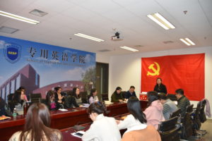 2017年12月20日中午,tyc8722太阳集团城直属党支部于西校区综合楼1016室召开预备党员转正大会,讨论关于2017级MTI硕士生段雅雯同志、杨帆同志和韩静伟同志申请转为正式党员的问题。出席本次大会的同志有学院直属党支部书记李莉文同志、副书记蔡鸿同志、党支部其他委员,以及党支部其他教师和学生党员共29人。本次大会由程熙旭老师和仵胜奇老师主持。本次出席会议的有表决权的党员有26人,其中学生10人,教师党员16人,超过本支部有表决权党员半数,符合人数规定。转正大会共分四项议程。
