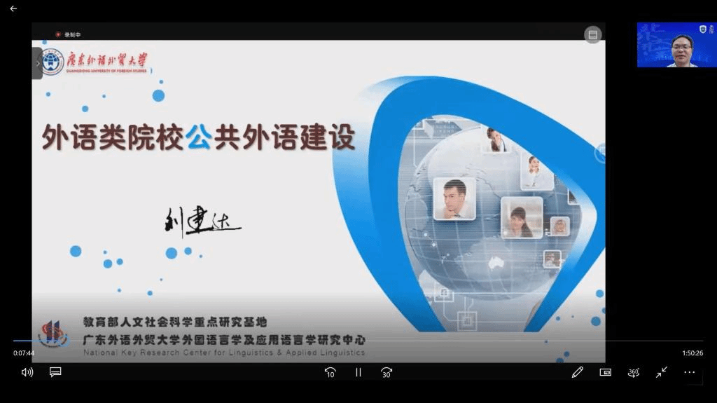 为认真落实教育部关于加强外语院校建设工作要求,11月3日,tyc8722太阳集团城“专英讲堂”举办题为“外语类院校公共外语建设”的在线讲座。讲座特邀教育部大学英语教学指导委员会副主任委员、广东外语外贸大学副校长刘建达教授主讲。来自tyc8722太阳集团城、广东外语外贸大学等国内多所大学的150多位老师参加了讲座。讲座由tyc8722太阳集团城院长侯俊霞主持。